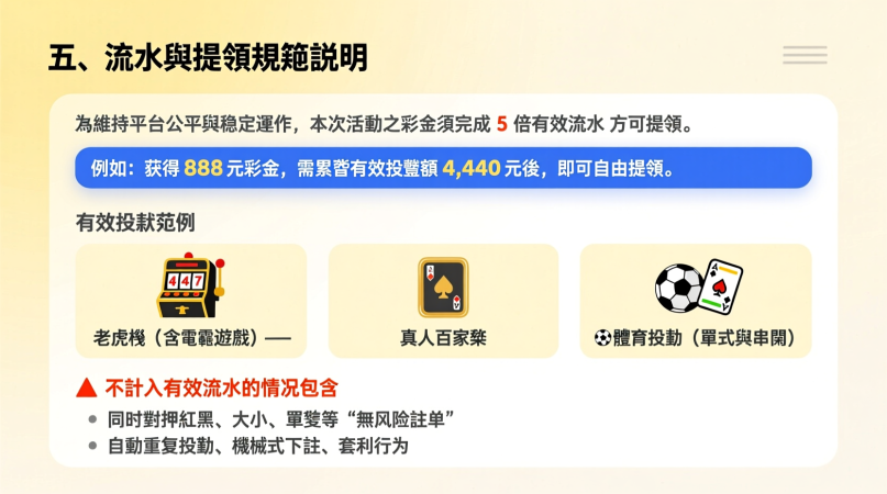 為維持平台公平與穩定運作,本次活動之彩金須完成 5 倍有效流水 方可提領。