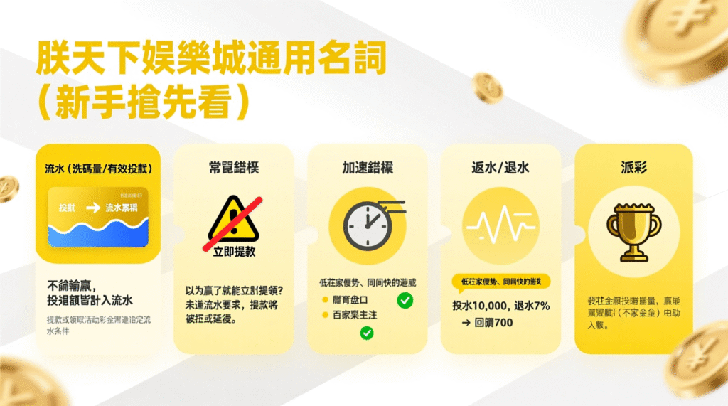 開場先說重點:第一次進入朕天下娛樂城,最容易卡在看不懂規則與賭博術語:流水、返水、派彩、限紅、盤口、串關、天牌、超級6、Pot Odds、Bluff……只要把這些術語更進一步的暸解,這樣在下注時自然更順、更穩,也更能享受遊戲本身的樂趣。下面這份「術語+解釋+情境例子」已全面優化與校正,你可以當口袋手冊用,隨查隨懂。